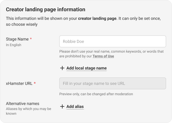 - Stage Name: Enter your preferred stage name. This name will be shown on your landing page. Do not use your real name unless you want it displayed on your landing page.